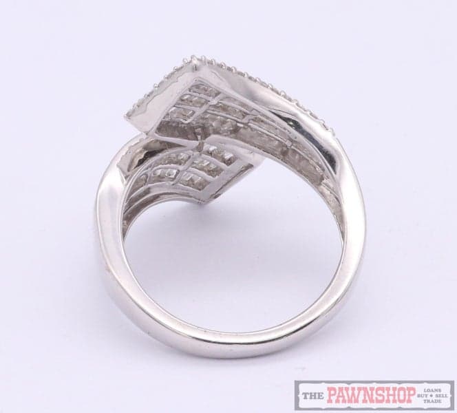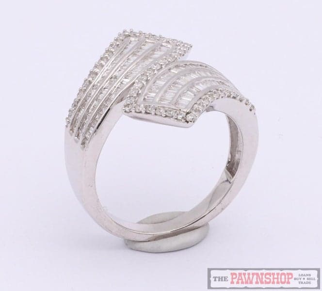 On offer here we have this gorgeous 9ct white gold diamond dress ring. This tapered low semi-round square edge "crossover" or "twist" style band features 108x straight and tapered baguette cut diamonds and 45x round brilliant cut diamonds.