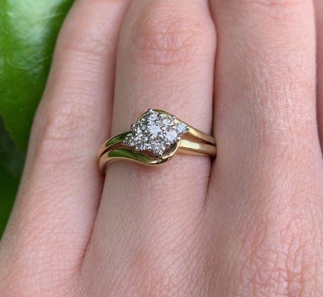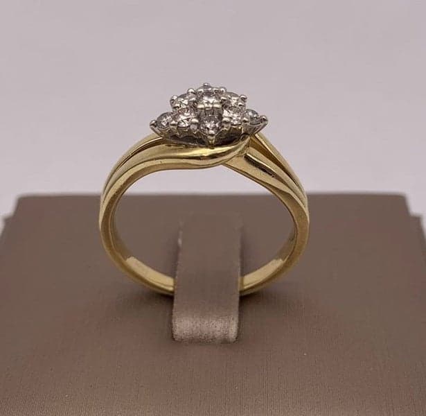 This ring features 9x round brilliant diamonds set in a cluster head crossover 9ct Yellow gold setting.
