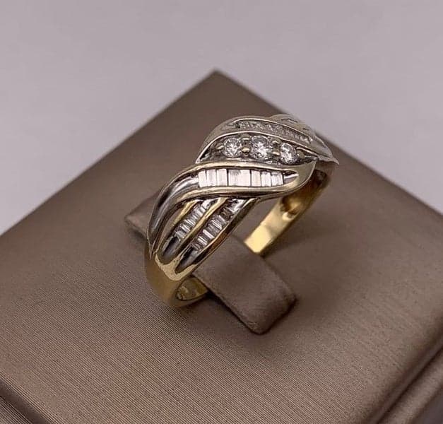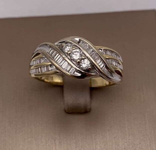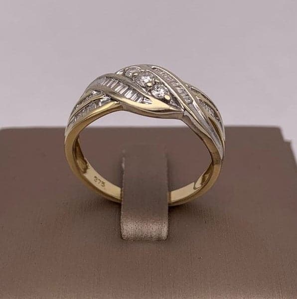 On offer here is a 9ct Yellow Gold Baguette & Round Brilliant Diamond Crossover Dress Ring.