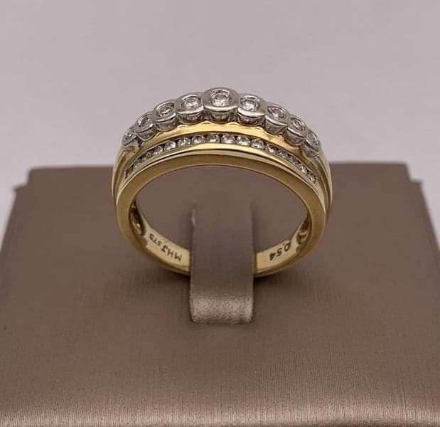 This ring features 1x row of graduated rub over set diamonds with 2x rows of channel set diamonds.
