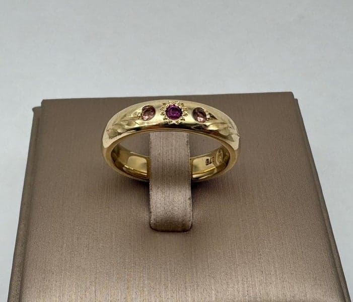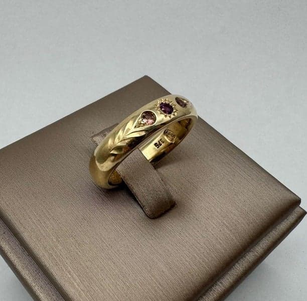 On offer here is a 9ct Yellow Gold Amethyst & Pink Topaz Band Ring