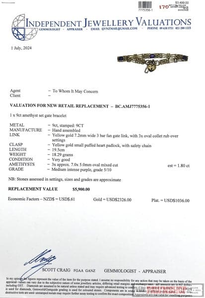 9ct Yellow Gold Amethyst Set Gate Bracelet with Puffed Heart Padlock ~ $5,900