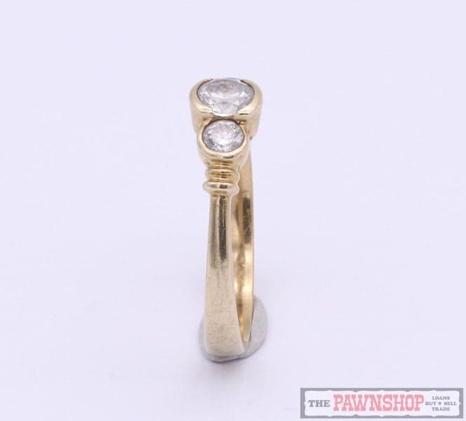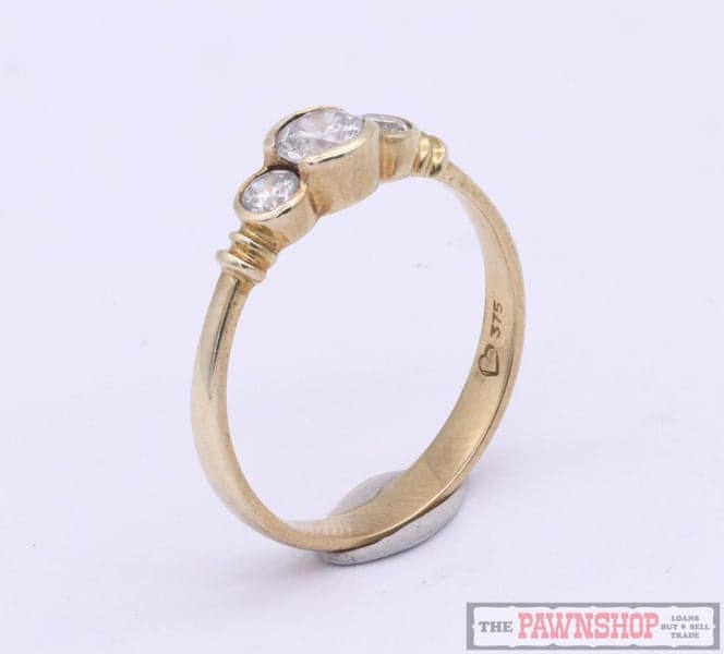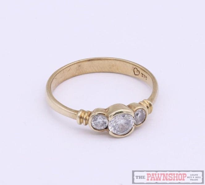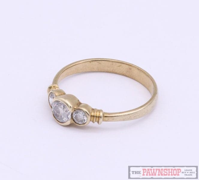 On offer here we have this elegant 9ct yellow gold cubic zirconia three stone ring.