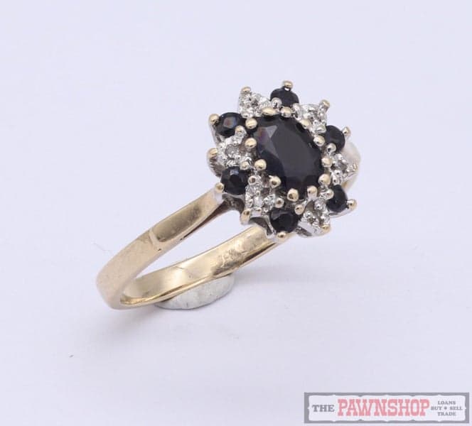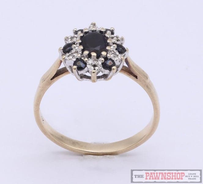 On offer here we have this 9ct Yellow Gold Sapphire and Diamond Cluster Ring.