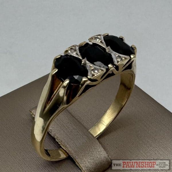 On offer here is a 9ct Yellow Gold Sapphire & Diamond London Bridge Ring