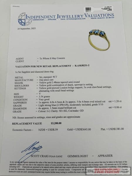 Replacement Value: $3,200 NZD