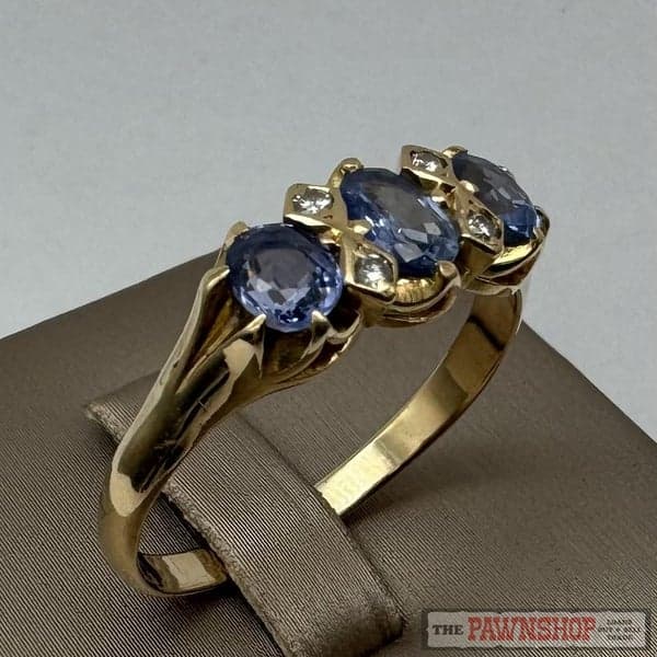 On offer here is a 9ct Yellow Gold Sapphire & Diamond London Bridge Ring