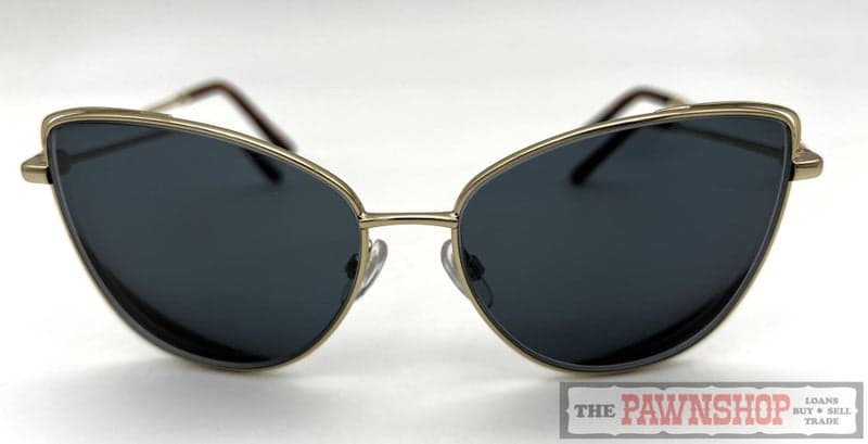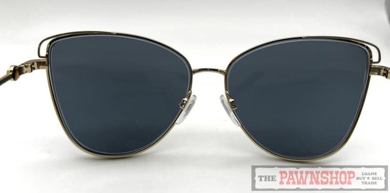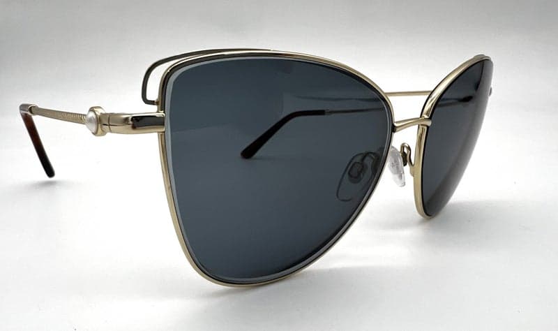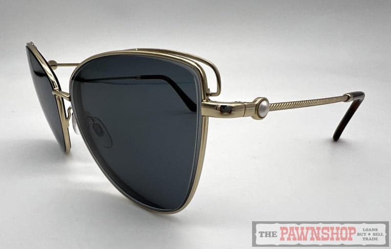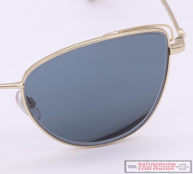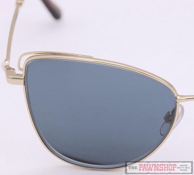 "Stylish sunglasses by Alex Perry in polished gold metal with butterfly shaped lens. A sophisticated look thanks to delicate pearl temple embellishments and rope patterned temples."