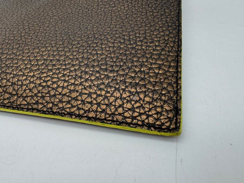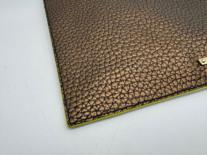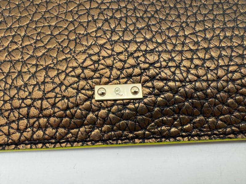 Metallic bronze gold pebbled leather with a neon yellow trim and black wrist loop.