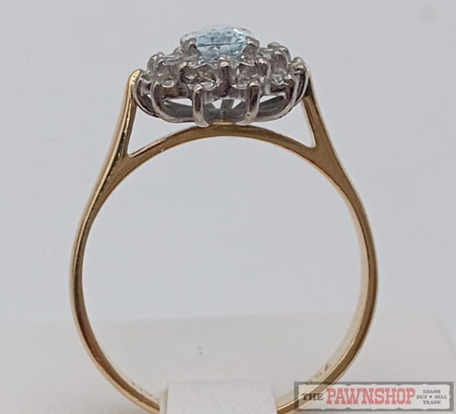 On offer here is a 18ct Yellow Gold and Palladium Blue Topaz and Diamond Cluster Ring