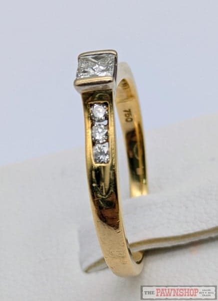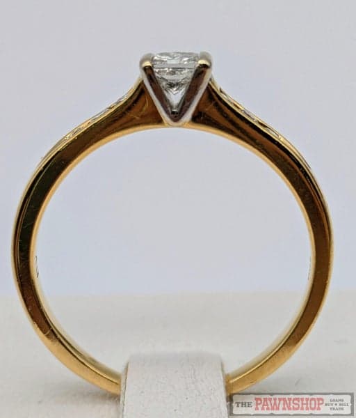 On offer here is a 18ct Yellow Gold Princess Cut Diamond Solitaire Ring with shoulder diamonds