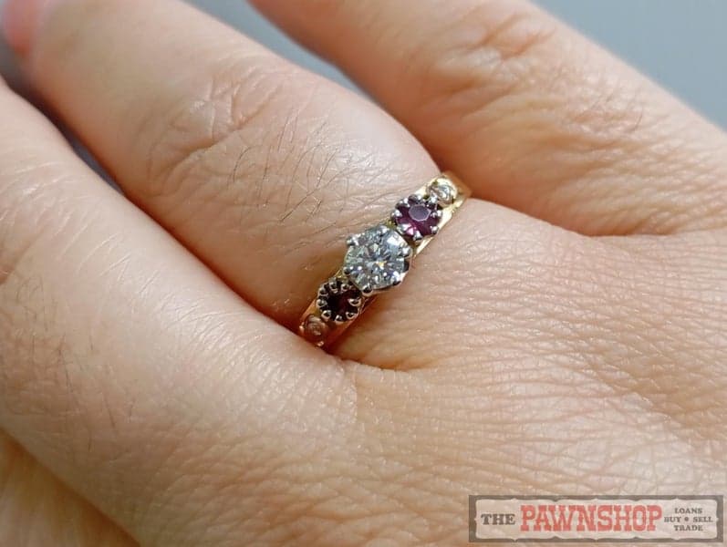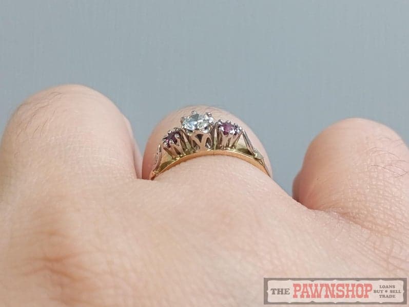 On offer here is a 18ct Yellow Gold Diamond and Ruby Three Stone Ring.