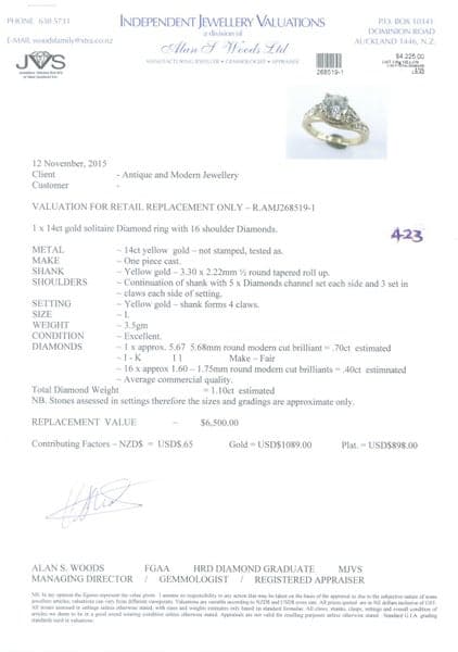 On offer here this Diamond Solitaire 14CT Yellow Gold Ring w/16 x Shoulder Diamonds.