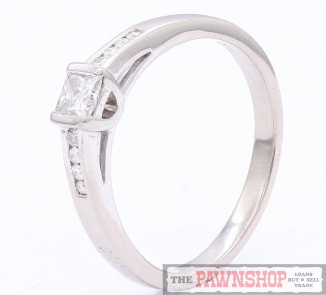 On offer here this Diamond Solitaire 18CT White Gold Ring with 8 x Shoulder Diamonds.