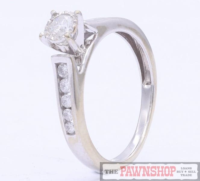 On offer here this Diamond Solitaire 9CT White Gold Ring with Shoulder Diamonds.