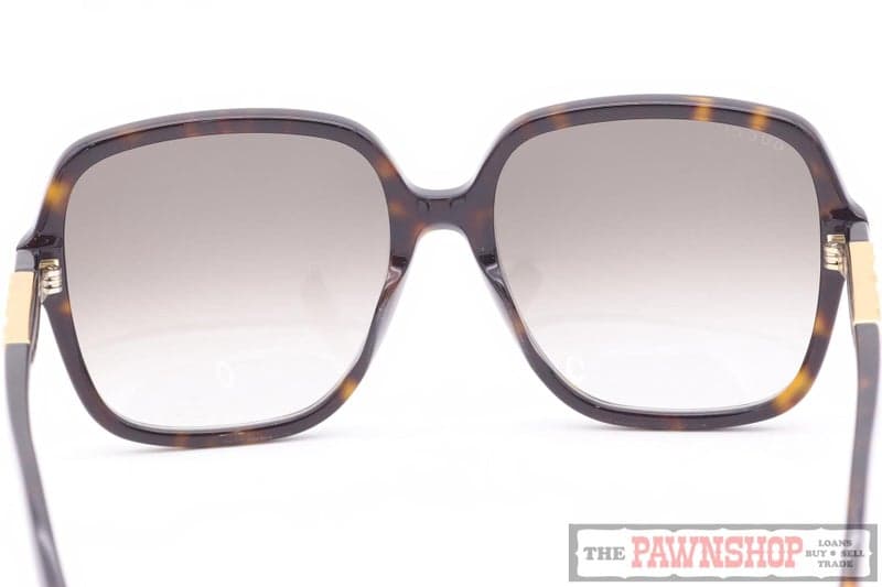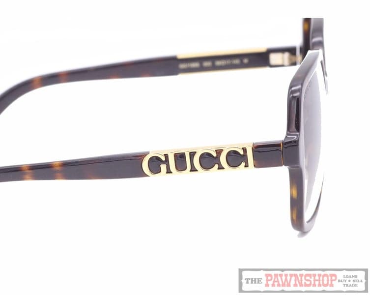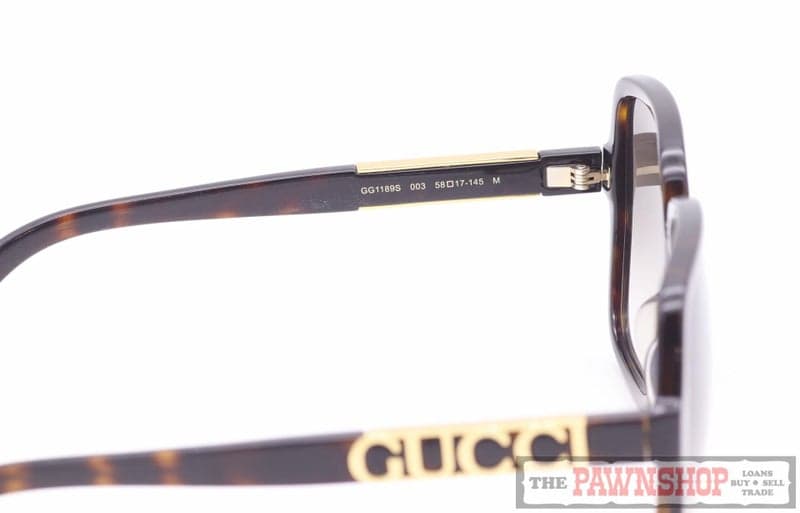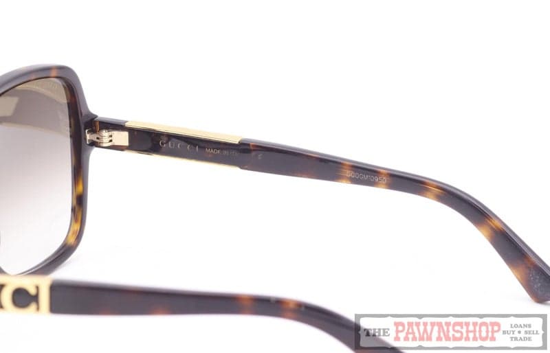 Shiny dark tortoiseshell acetate temples with bold gold-toned 'Gucci' lettering