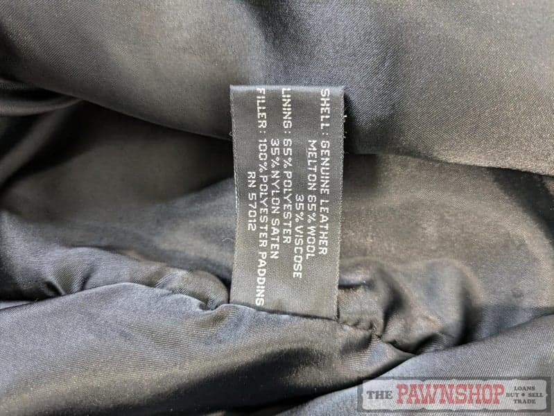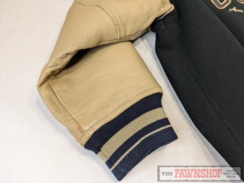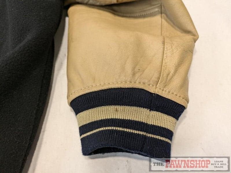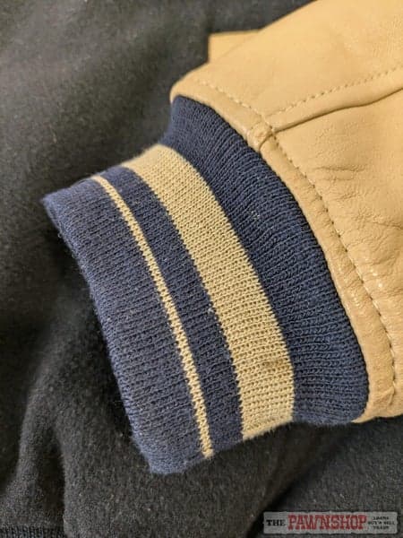 Navy wool-blend outer is 65% wool and 35% viscose, according to the inner label, with contrasting tan leather sleeves and striped ribbed cuffs, collar, and hem in navy and tan.