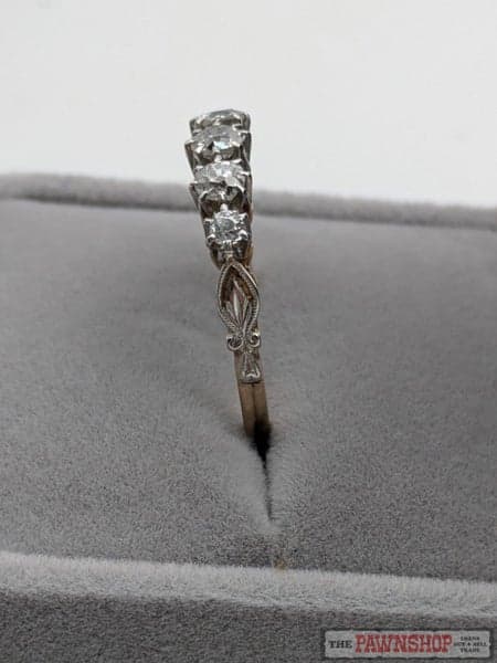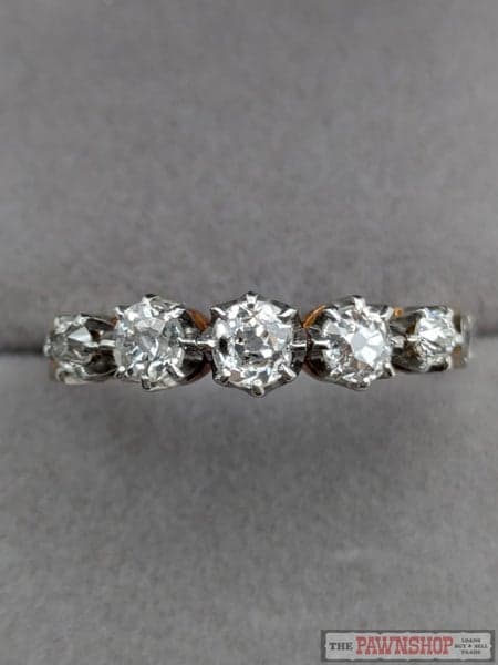 On offer here is a 18ct Yellow Gold and Platinum Handmade Diamond Five Stone Ring