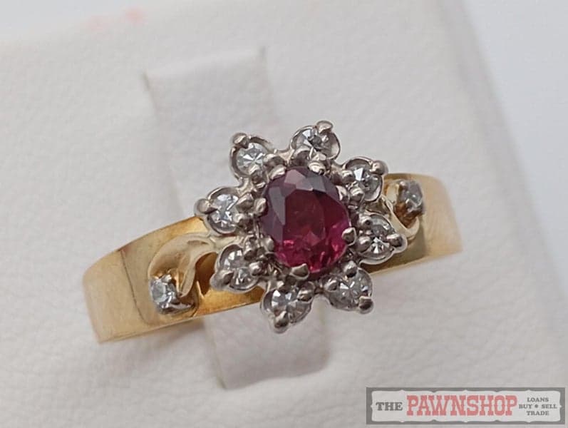 On offer here is a 18ct Yellow Gold Ruby and Diamond Cluster Ring