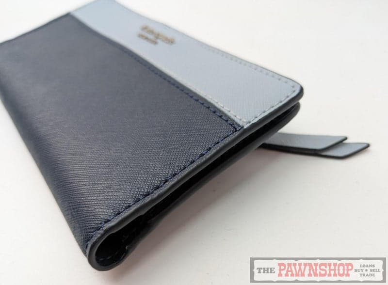 "The Kate Spade Cameron Large Bifold Wallet in Navy /Light Blueis a stylish and functional accessory designed for women. With the signature kate spade new york brand, this wallet features a spacious interior with multiple card slots and a generous currency compartment. The beautiful two tone blue colours add a pop of color to any outfit, making it a practical and fashionable choice for everyday use."