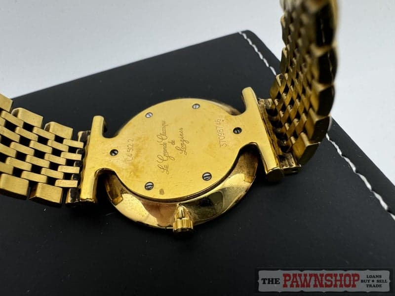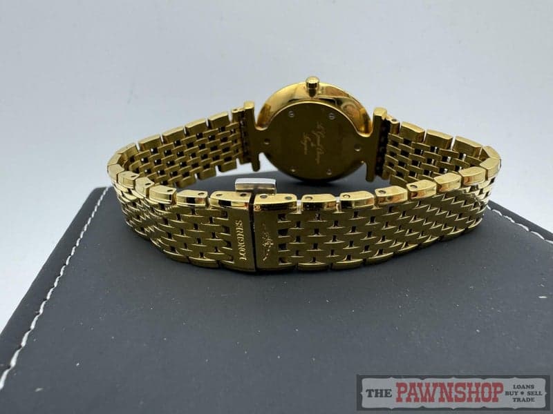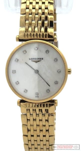 This Longines watch features a stainless steel gold plated case, mother of pearl dial with stone set markers, sapphire crystal glass, quartz movement, stainless steel gold plated double deployment clasp.