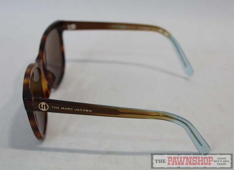 "MARC JACOBS sunglasses in a warm tortoiseshell acetate with oversized lenses. The acetate sides feature a brown to crystal-blue gradient and MARC JACOBS branding at the temple, including a double J raised plaque."