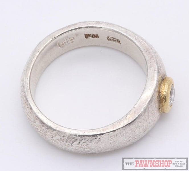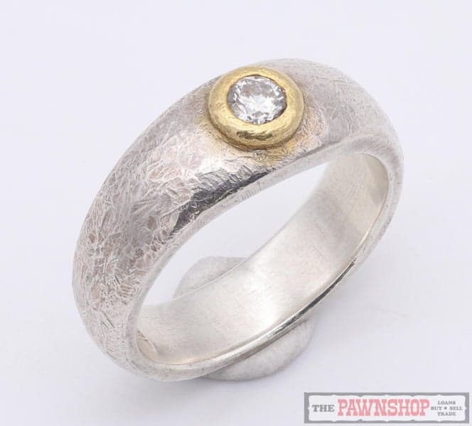 On offer here we have this sterling silver and 22ct yellow gold dress ring featuring 1x diamond, set in a 22kt yellow gold rubover setting on a tapered semi round patterned surface sterling silver band.