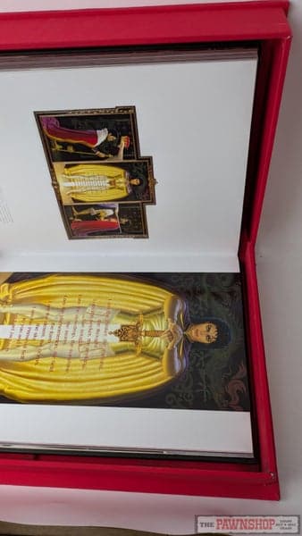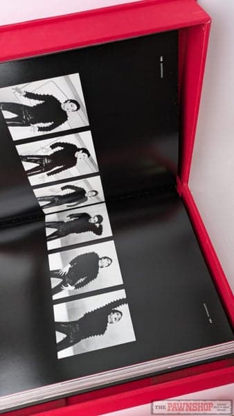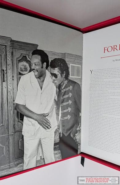 "Comprising over 400 lavish pages, this beautiful volume is printed on luxury heavyweight art paper and bound in a sumptuous black leather-effect hardcover with gold-foil title embossing. The Opus is housed in its original protective red case, with a white glove, a fitting tribute to the King of Pop’s iconic style. Inside, this masterpiece features over 300 spectacular photographs, many previously unseen, chronicling Michael Jackson's life and career from his early days with the Jackson 5 through to his final rehearsals for "This Is It." Highlights include vibrant full-page portraits, behind-the-scenes imagery, and intimate candid shots that reveal Michael's creativity and charisma. Special inclusions in this edition are reproductions of handwritten lyrics and notes, including rare ephemera such as the annotated "We Are The World" sheet music, concert sketches, and personal handwritten directives for artwork and stage concepts. Accompanying these visuals are heartfelt tributes and exclusive essays by friends, family members, and prominent figures in the entertainment industry, providing unique insight into Michael’s legacy."