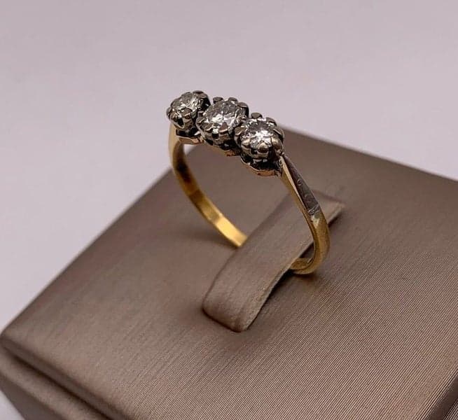 This very beautiful vintage style ring features 3x early round brilliant cut diamonds. The setting is yellow gold with white gold claws & bezel supports.
