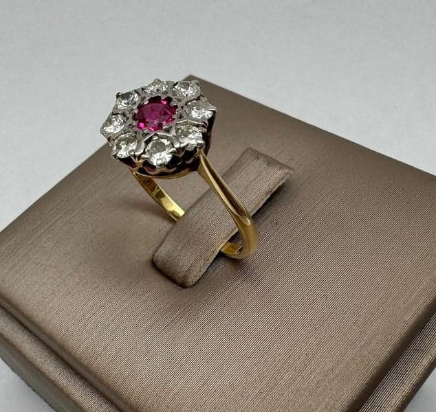 This ring features a central natural ruby with 8x surrounding diamonds set in an 18ct yellow gold round cluster setting.