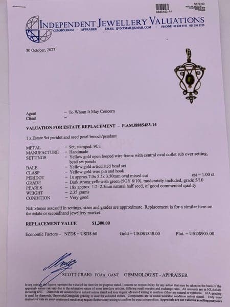 Vintage 9ct Yellow Gold Peridot & Seed Pearl Pendant/ Brooch ~ $1,300!
