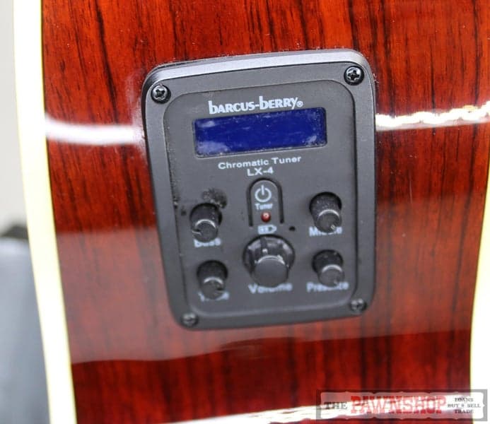 "The AG70CE is a Grand Auditorium style acoustic featuring a cutaway and a custom Barcus-Berry LX4 pickup tuner system for superior acoustic tone when plugged in. A select spruce top and Ovankol back and sides provide tonal projection. The mahogany neck features a fingerboard with offset dot inlays and flame maple capped head stock with chrome die-cast tuners. The Barcus-Berry LX4 features a 3-band EQ, Presence control, and a built-in tuner for fast accurate tuning."